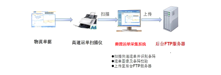 奥普思凯运单采集系统与专用的扫描仪进行配合,通过标准TWAIN接口,对快递运单进行快速扫描,自动识别运单上的条码。在图像处理完毕后,过预先给定的FTPServer的访问参数,将识别成功的运单影像文件上传至指定服务器路径下。